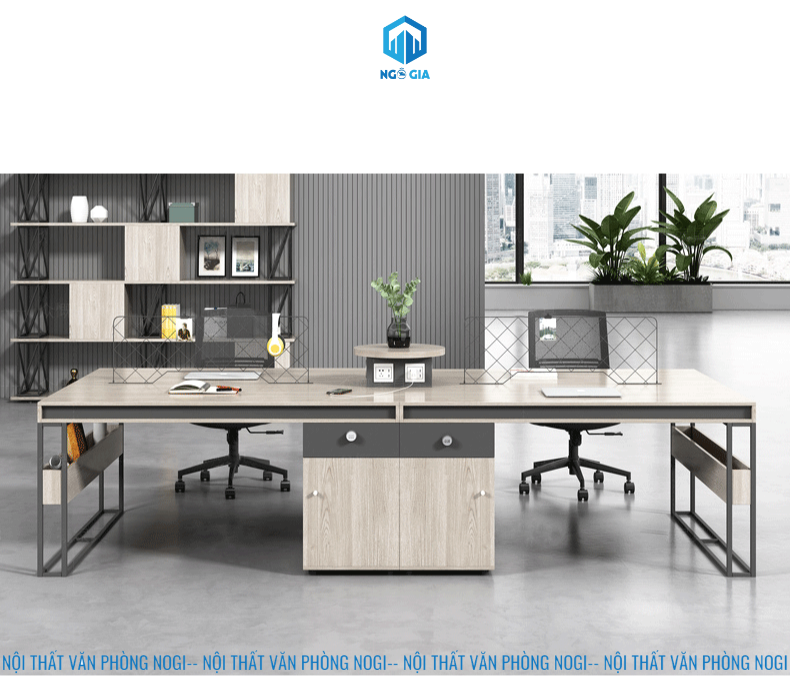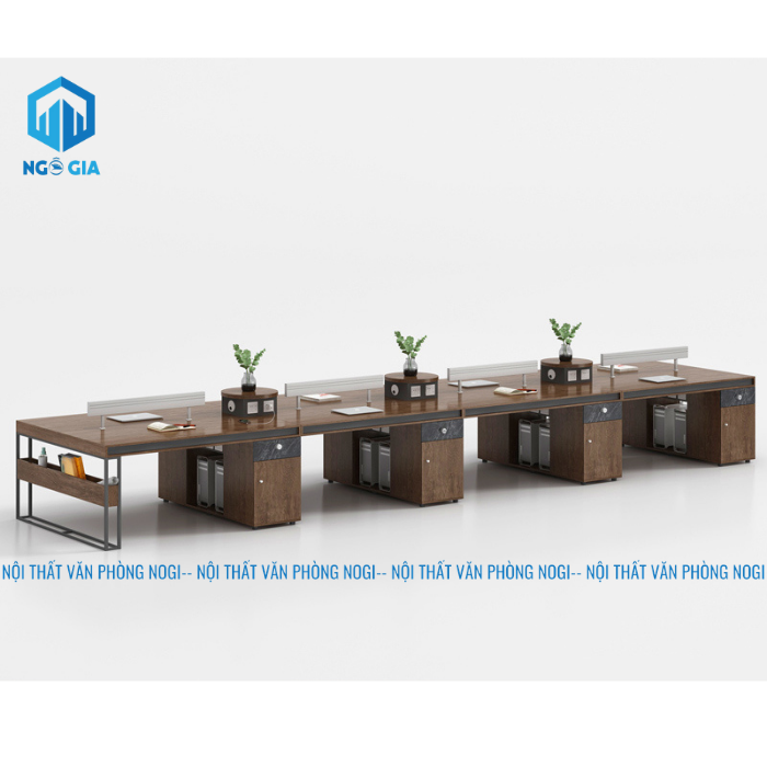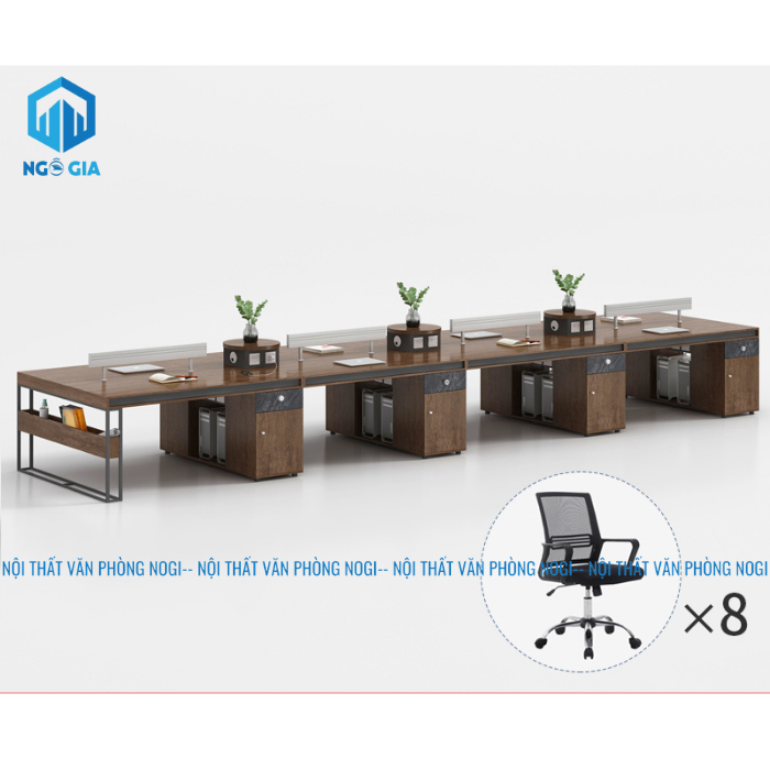 Việc sử dụng module bàn làm việc dành cho 8 người làm cho việc trao đổi, thảo luận giữa các nhân viên với nhau trở nên dễ dàng và thuận tiện hơn. Từ đó hiệu quả công việc cũng được nâng cao. Ngoài ra, mẫu bàn này còn đảm bảo việc cá nhân hóa, mỗi người đều có không gian làm việc riêng bằng các vách ngăn.
