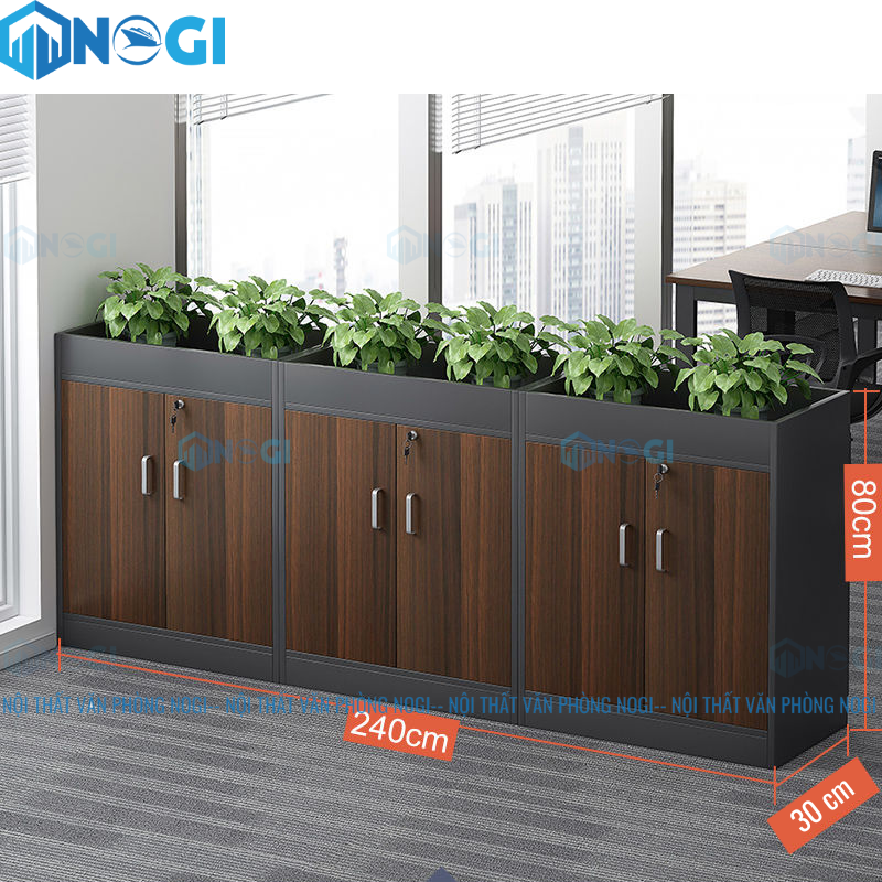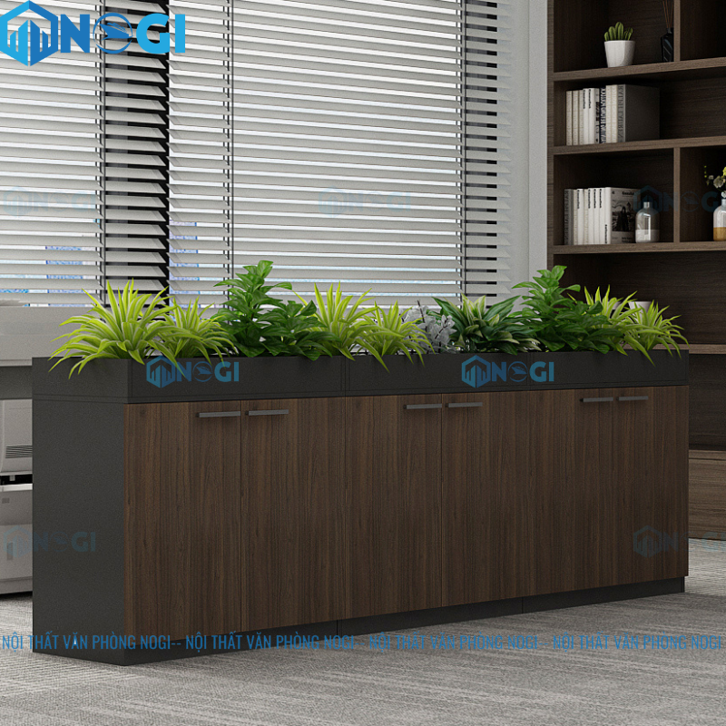 Mẫu tủ này là sự kết hợp hiện đại, vừa để lưu trữ, chứa đựng đồ đạc, vừa có thể tận dụng để trồng cây trang trí. Trồng cây trong văn phòng giúp cải thiện không khí xung quanh, tạo cảm giác thoải mái khi làm việc. Bạn có thể lựa chọn các loại cây phong thủy mang lại sự may mắn, thuận lợi cho công việc.