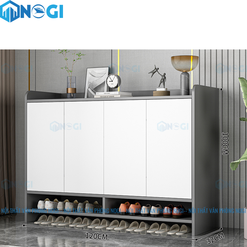 Tủ được thiết kế theo kích thước H1000 x W1200 x D320, thuộc kiểu hình chữ nhật nằm ngang. Sản phẩm được chia thành 7 ngăn, trong đó 3 ngăn dưới cùng để giày dép hàng ngày và 4 ngăn trên có cánh cửa tiện lợi. Bạn có thể tận dụng phần bề mặt trên cùng của tủ để trưng bày vật trang trí hoặc đồ đạc cá nhân.