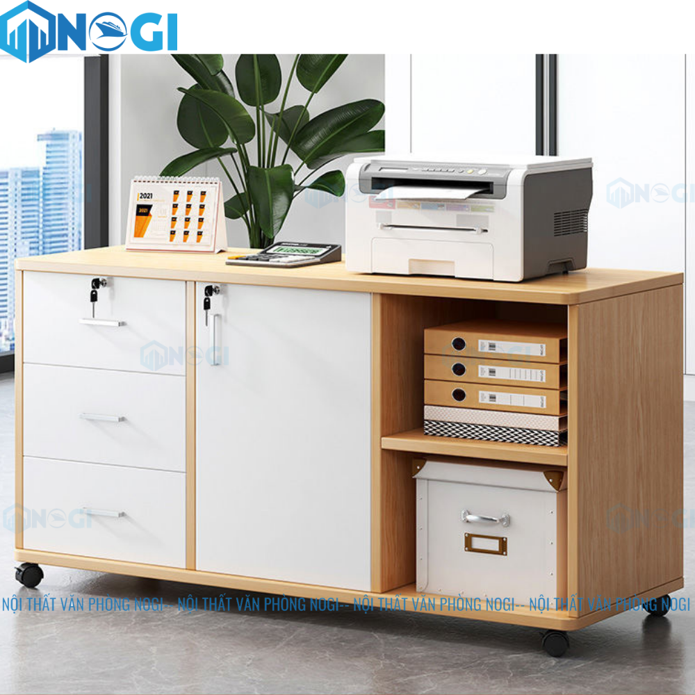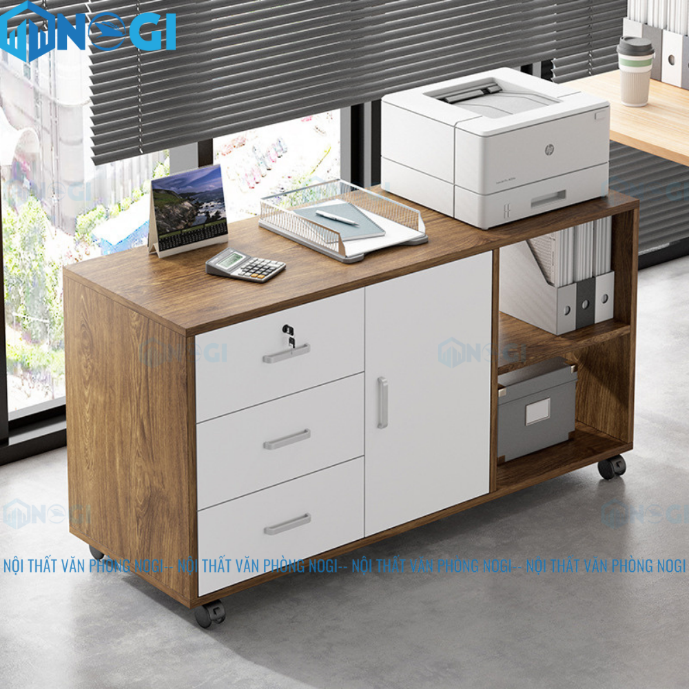 Tủ được thiết kế gồm 6 ngăn trong đó có 3 ngăn kéo, 2 ngăn hở và 1 ngăn đóng cánh. Bề mặt tủ rộng có thể tận dụng để đồ trang trí, máy in, sách,... Hơn nữa, trên mỗi ngăn có tay cầm, giúp mở cửa tủ dễ dàng và đơn giản hơn. Phía dưới chân tủ có bốn bánh xe bằng nhựa PU, giúp vệ sinh dưới gầm tiện lợi hơn.