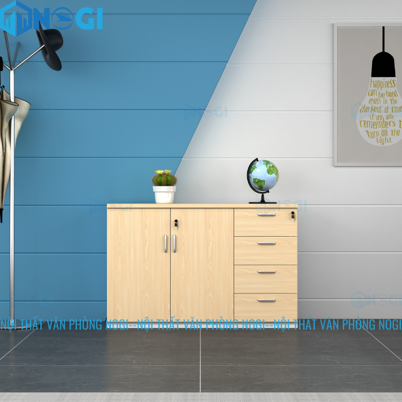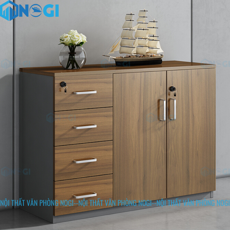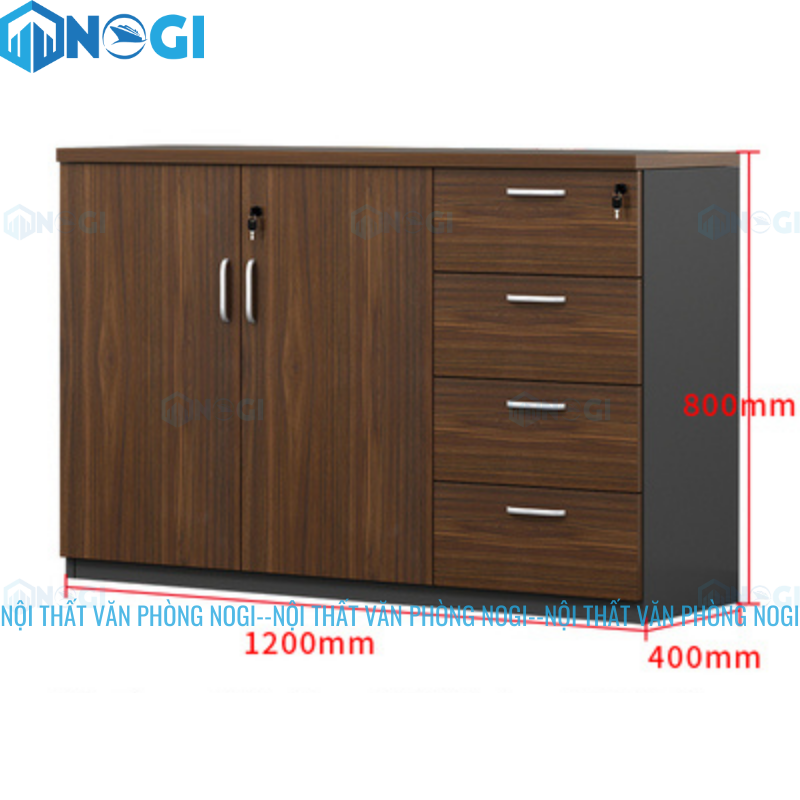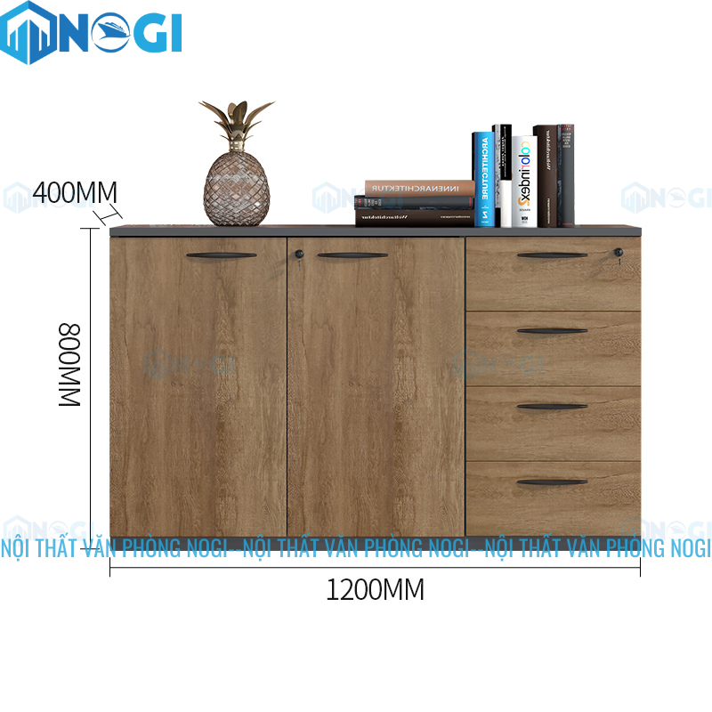 Tủ được thiết kế theo kích thước W1200 x H800 x D400, có kiểu dáng hình chữ nhật nằm nên giúp tiết kiệm không gian, diện tích văn phòng. Sản phẩm gồm hai ngăn cabinet có cánh tủ làm từ gỗ công nghiệp cao cấp và 4 ngăn hộc kéo nên bạn có thể phân chia tài liệu theo ý muốn hoặc theo danh mục.
