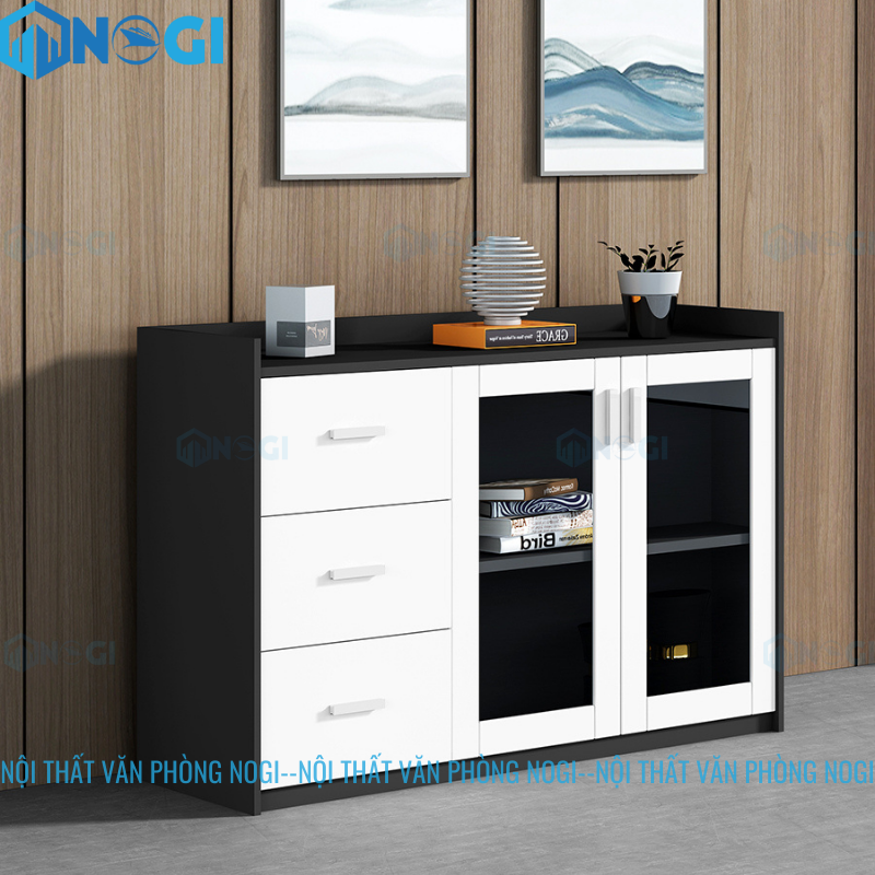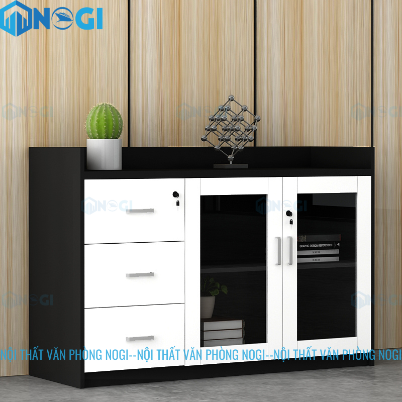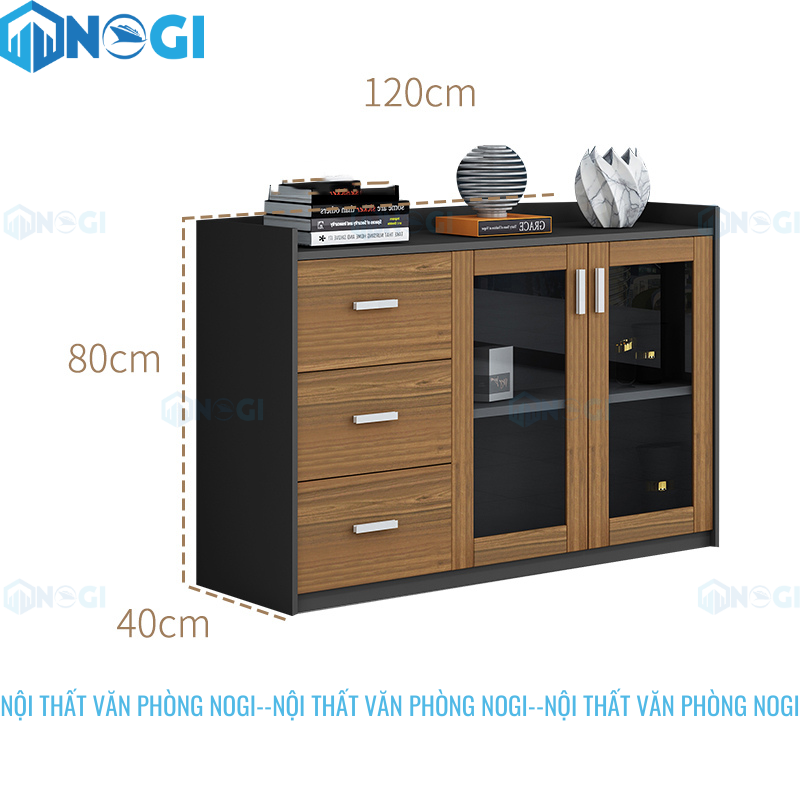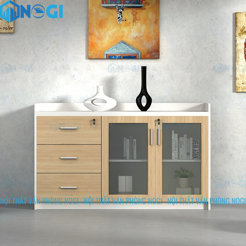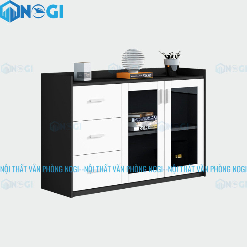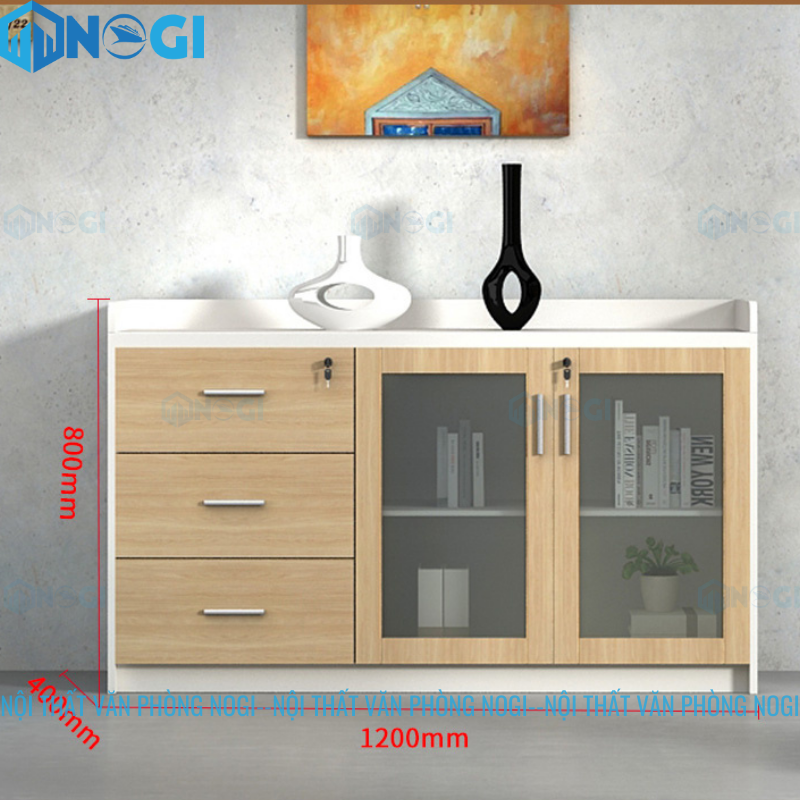 Tủ được thiết kế theo kích thước W1200 x H800 x D400, có kiểu dáng hình chữ nhật nằm nên giúp tiết kiệm không gian, diện tích văn phòng. Sản phẩm gồm hai ngăn cabinet có cánh tủ làm từ kính và 3 ngăn hộc kéo nên bạn có thể phân chia tài liệu theo ý muốn.